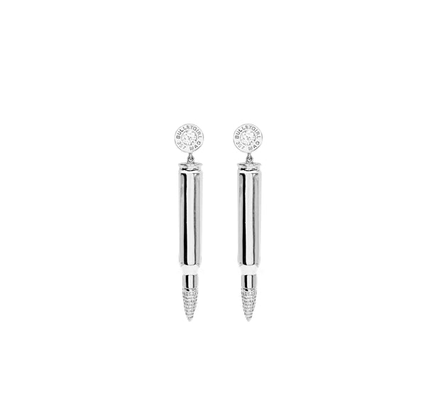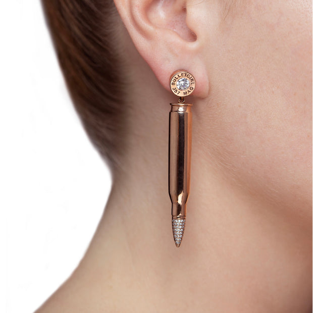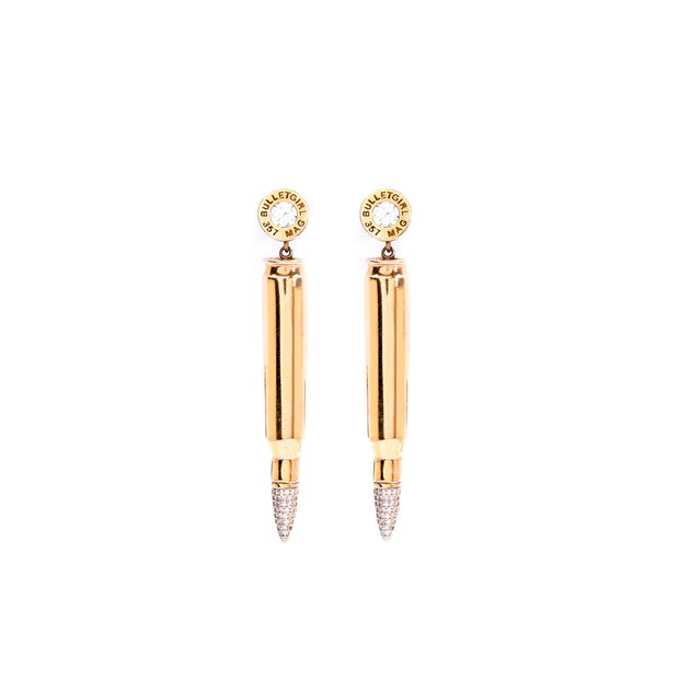 Reproduced brass .223 Remington bullet with pavé tip and .357 Magnum bullet cap with white CZ, bathed in Rose Gold, Yellow Gold, and Black Rhodium, or Rhodium